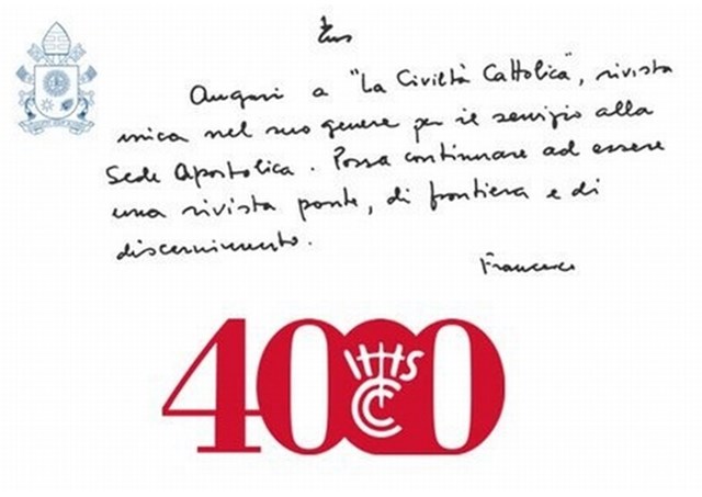 “Felicidades a ‘La Civiltà Cattolica’, revista única en su género por el servicio a la Sede Apostólica. Pueda continuar a ser una revista puente, de frontera y de discernimiento”, lo escribe el Papa Francisco en un quirógrafo publicado en la histórica revista de los jesuitas con ocasión de la publicación del número 4000.
