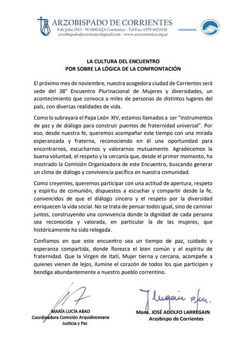 Por último, se expresó el deseo de que este evento sea un tiempo de paz, cuidado y esperanza compartida, “donde florezca el bien común y el espíritu de fraternidad”, y se pidió a la Virgen de Itatí que acompañe a quienes participen del encuentro y bendiga al pueblo correntino.