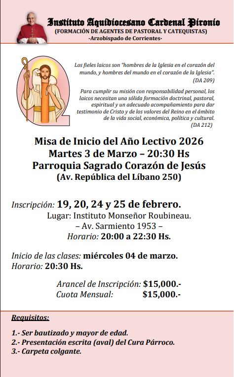 El Instituto Arquidiocesano Cardenal Pironio anunció el inicio de un nuevo ciclo lectivo 2026 e invitó a la comunidad a sumarse a su propuesta de formación destinada a agentes de pastoral y catequistas.