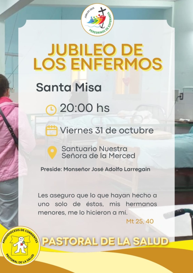Este viernes a las 20, en el Santuario de Nuestra Señora de la Merced, de la ciudad de Corrientes se llevará a cabo el Jubileo de los Enfermos, una celebración eucarística organizada por la Pastoral de la Salud Arquidiocesana.