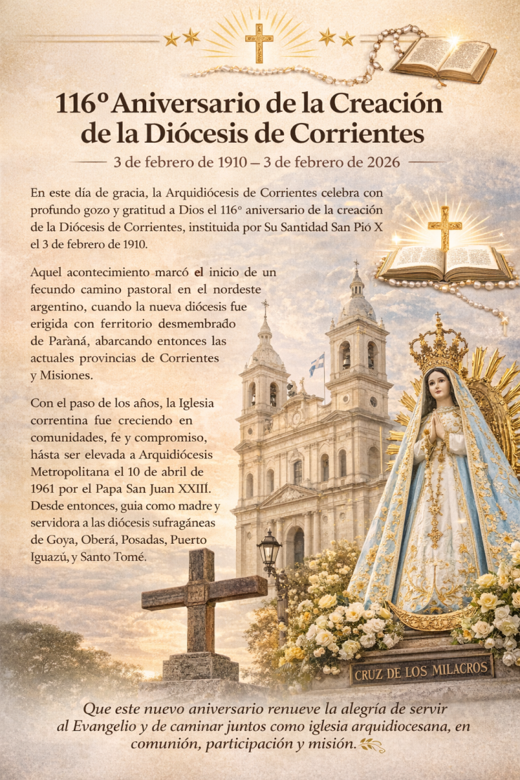 La Arquidiócesis de Corrientes celebró este 3 de febrero el 116° aniversario de la creación de la Diócesis de Corrientes, instituida en 1910 por el Papa San Pío X, un hecho que marcó el inicio del desarrollo pastoral de la Iglesia en el nordeste argentino.