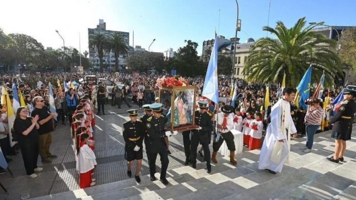 La celebración se realizó en el atrio de la catedral, luego de una caravana que recorrió, durante seis horas y media, distintas comunidades parroquiales. La procesión se inició en la parroquia San Miguel Arcángel, en el marco de los 200 años de la ratificación como patronos de San Miguel y de la Virgen del Rosario.