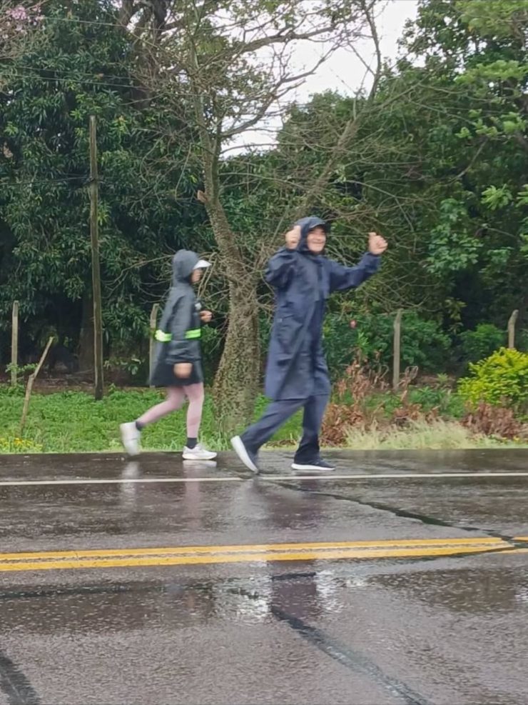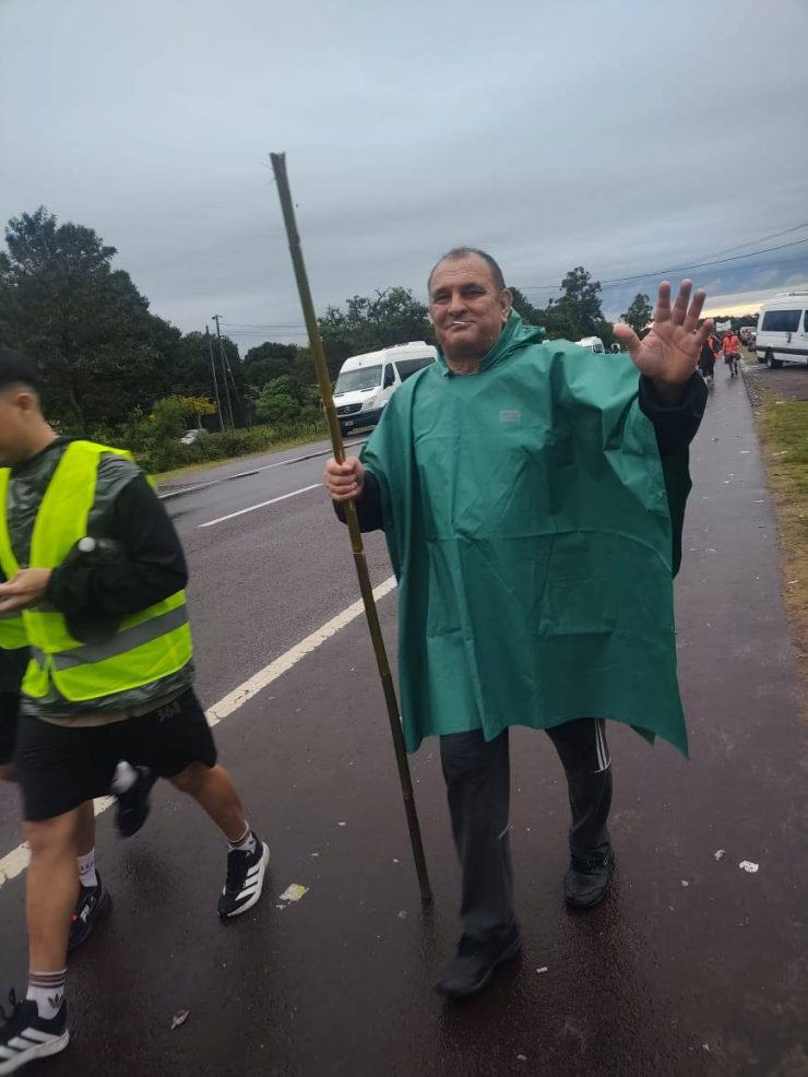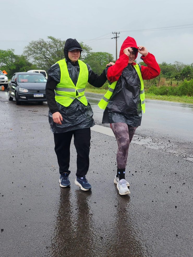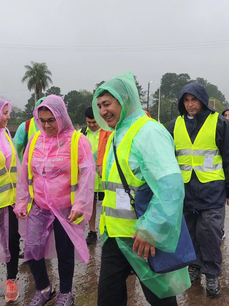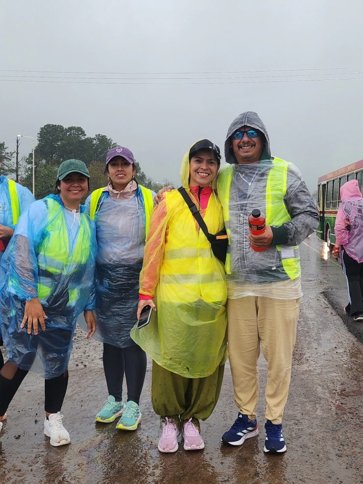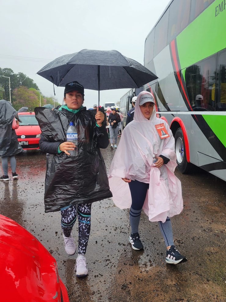 Con paraguas, capas plásticas, banderas y estandartes que identificaban a cada grupo, los peregrinos avanzaron por la ruta entonando cánticos y oraciones. La emoción se reflejaba en cada paso, en las sonrisas compartidas y en la fuerza colectiva que los impulsaba a seguir pese al cansancio.